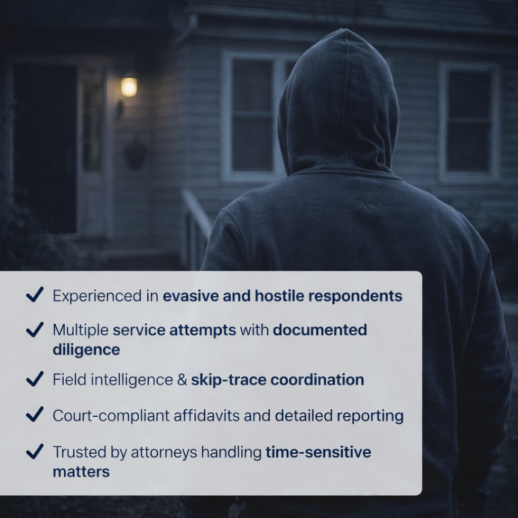 Difficult and evasive respondents require professional process serving built around observation, timing, and lawful execution, not repeated unsuccessful visits.